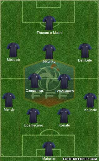 Griezmann · Dembélé · Mbappé · Camavinga · Rabiot · Tchouameni · T. Hernandez · Koundé · Saliba · L. Hernandez · Maignan