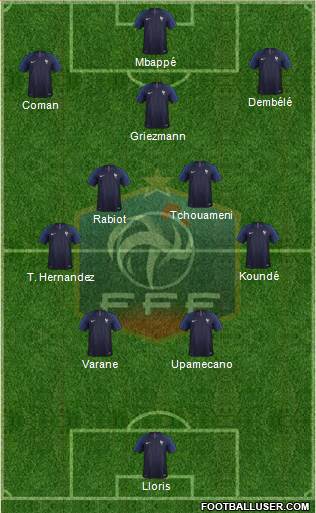 Griezmann · Dembélé · Mbappé · Camavinga · Rabiot · Tchouameni · Koundé · T. Hernandez · L. Hernandez · Upamecano · Maignan