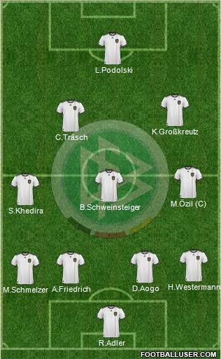 G : Neuer · DL : Boateng · DC : Friedrich · DC : Mertesacker · DL : Lahm · MDG : Schweinsteiger · MDD : Khedira · MOG : Podolski · MOC : Özil · MOD : Müller · B : Klose