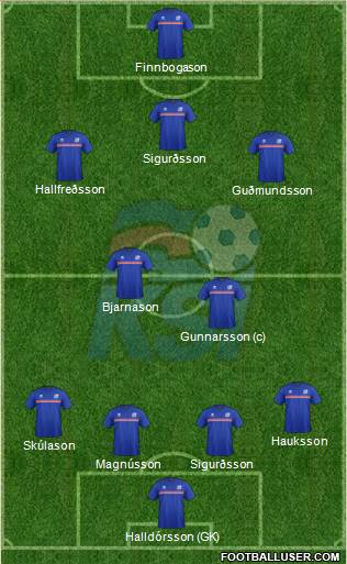 Halldórsson (GK) · Magnússon · Sigurðsson · Skúlason · Hauksson · Gunnarsson (c) · Bjarnason · Guðmundsson · Hallfreðsson · Sigurðsson · Finnbogason