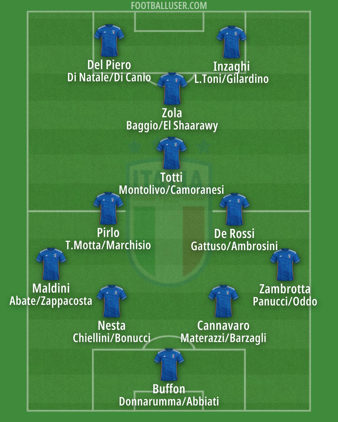 BUFFON · MALDINI · CANNAVARO · NESTA · ZAMBROTTA · PIRLO · GATTUSO · AMBROSINI · TOTTI · DEL PIERO · GROSSO