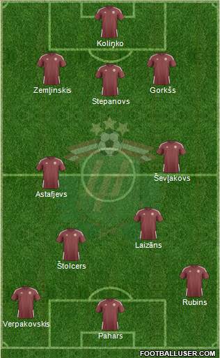 1. Kolinko · 2. Stepanovs · 4. Zemļinskis · 6. Straume · 3. Ševalakovs · 5. Laizāns · 7. Štolcers · 11. Astafjevs · 10. Rubins · 9. Verpakovskis · 17. Pahars