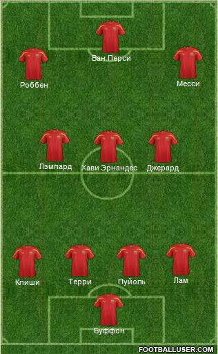 Casillas · Thiago Silva · Vidic · Dani Alves · Ashley Cole · Xavi Hernández · Iniesta · Ozil · Ronaldo · Messi · Ibrahimovic