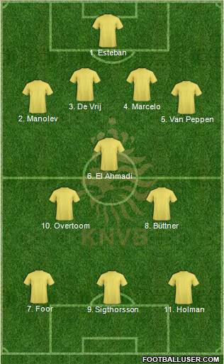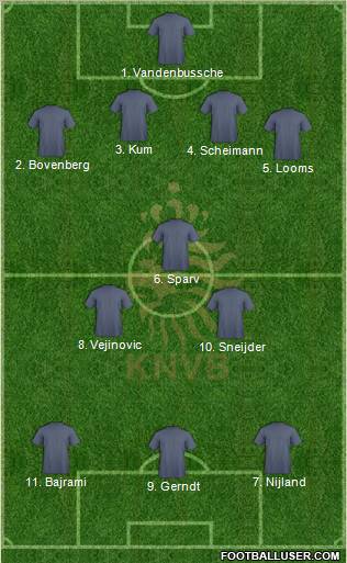 Huntelaar · Robben · Dost · Van Wolfswinkel · Van Persie · Van der Vaart · Sneijder · Van Bommel · Heitinga · Mathijsen · Stekelenburg