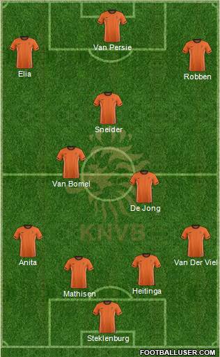 Stekelenburg · Mathijssen · Heitinga · Emanuelson · Van der Wiel · Van Bommel · Van der Vaart · Affelay · Sneijder · Van Persie · Robben