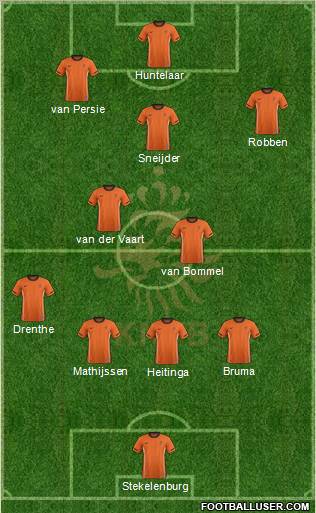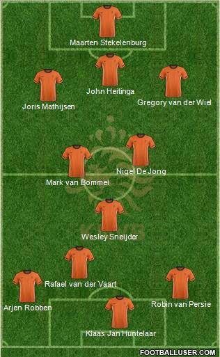 Stekelenburg · Mathijsen · Heitinga · Pieters · VD Wiel · N de Jong · Sneijder · VD Vaart · Robben · Van Persie · Huntelaar