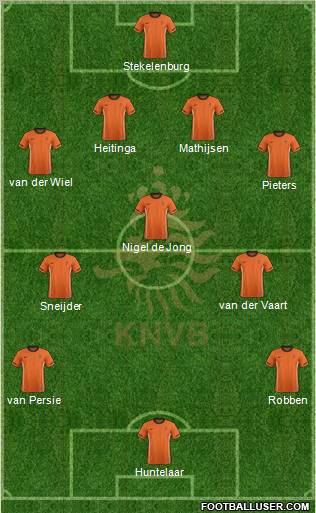 Stekelenburg · Drenthe · Mathijssen · van der Wiel · Heitinga · Strootman · van Bommel · Kuijt · Kuijt · Kuijt · Sneijder · Robben · Kuijt · van Persie