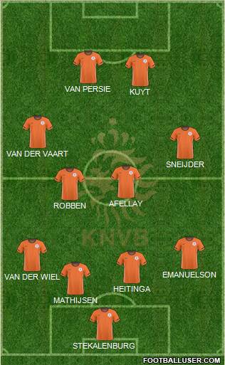 Stekelemburg 84 · Ooijer 81 · Marcellis 74 · Van Der Wiel 79 · Braahfied 81 · Van Der Vaart 84 · De Jong 78 · Sneijder 89 · Kuyt 87 · Van Persie 88 · Huntelaar 85