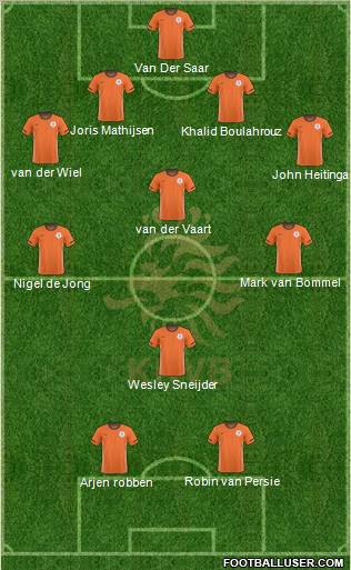 Stekelenburg · Heitinga · Mathijsen · Van der Wiel · Pieters · N.De Jong · Sneijder · Van der Vaart · Robben · Kuyt · Van Persie