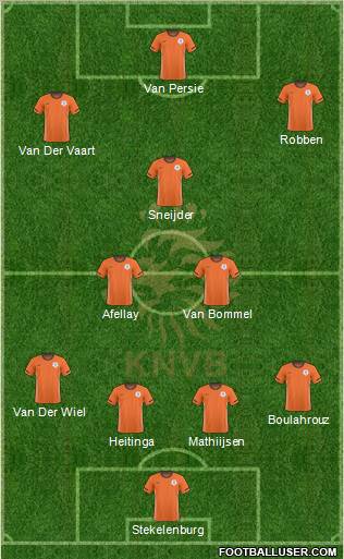 Van Persie · Kuyt · Robben · Sneijder · Van Der vaart · De Jong · Emanuelson · Van Der Wiel · Mathijsen · Heitinga · Stekelenburg
