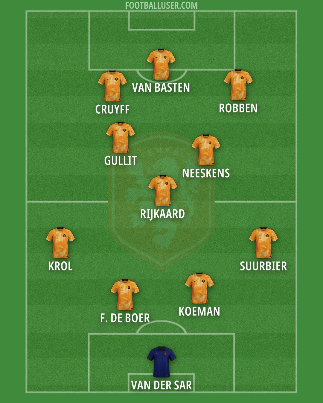 E.van der Sar (1) · W.Suurbier (2) · Ruud Krol (5) · F.de Boer (3) · R.Koeman (4) · C.Seedorf (8) · F.Rijkaard (7) · W.Sneijder (10) · R.Gullit (6) · M.van Basten (9) · R.van Persie (11)