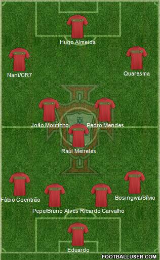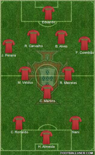 Eduardo · Carvalho · Pepe · Sílvio · Coentrão · Moutinho · Meireles · Martins · Ronaldo · Varela · Postiga