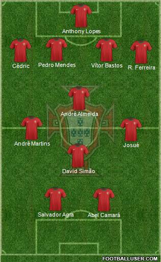 RUI PATRICIO · PEPE · B. ALVES · J. PEREIRA · F. COENTRAO · R. MEIRELES · M. VELOSO · J. MOUTINHO · C. RONALDO · NANI · H. POSTIGA