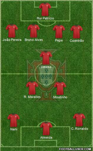 Rui Patricio · B. Alves · F. Coentrao* · Pepe · Joao Pereira · M. Veloso · R. Meireles · Joao Moutinho · Nani · Cristiano Ronaldo · H. Postiga