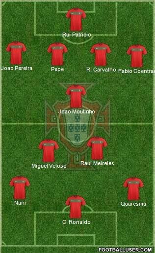 Almeida · Nani · Ronaldo · Moutinho · Meireles · Miguel Veloso · Coentrao · Pereira · Pepe · Alves · Rui Patricio