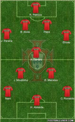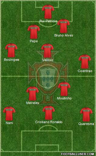 Rui Patricio · Bruno Alves · Pepe · Fabio Coentrao · Joao Pereira · Miguel Veloso · Raul Meireles · Joao Moutinho · Cristiano Ronaldo · Quaresma · Hugo Almeida