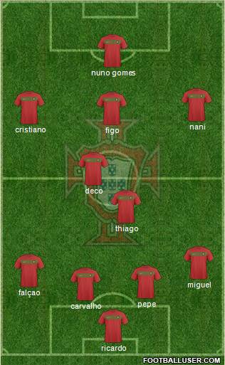 hilario · carvalho · pepe · bruno alves · rolando · Deco · Tiago · Christianno Ronaldo (c) · coentrao · Nani · Nuno Gomes
