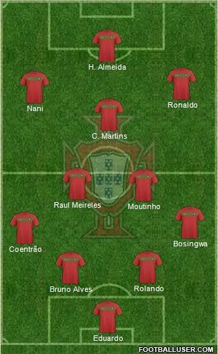 Eduardo · Rolando · Carvalho · Coentrão · Sílvio · Pepe · R. Meireles · J. Moutinho · Nani · C. Ronaldo · Hugo Almeida