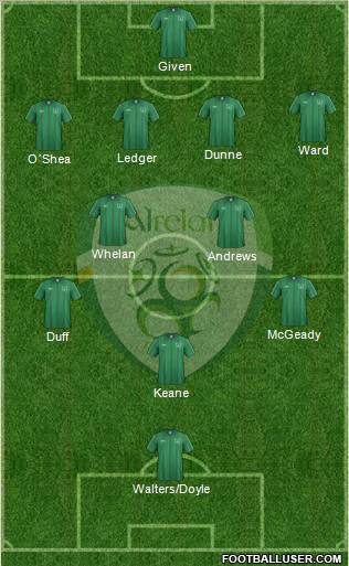 Shay Given · Richard Dunne · John O'Shea · Stephen Ward · Stephen Kelly · Keith Andrews · Darron Gibson · Damien Duff · Aiden McGeady · Kevin Doyle · Robbie Keane