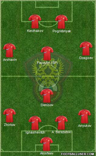 Akinfeev · Berezutskiy · Anyukov · Zhirkov · Ignashevich · Dzagoev · Semshov · Zyryanov · Kerzhakov · Arshavin · Pavlyuchenko
