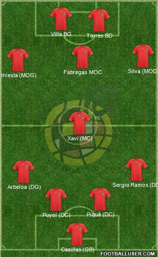 Casillas · Pique · Ramos · Puyol · Capdevilla · Busquets · Iniesta · Xavi · Fabregas · Villa · Torres