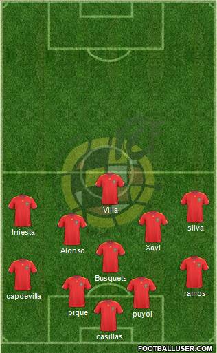 Torres · Villa · Navas · Iniesta · Fabregas · Xavi · Silva · Puyol · Pique · Ramos · Casilias