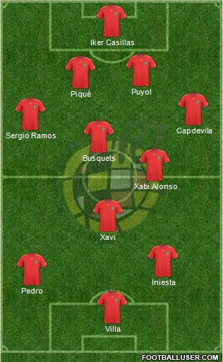 David Villa · Fernando Torres · Fabrégas · Xavi · Iniesta · David Silva · Puyol · Arbeloa · Sergio Ramos · Piqué · Casillas