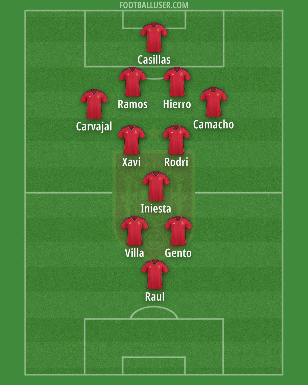 사비 (에르난데스) · 안드레스 (이니에스타) · 로드리 · 라민 야말 · 라울 · 페르난도 (토레스) · 사비 (알론소) · 세르히오 (라모스) · 페르난도 (이에로) · 호세 안토니오 (카마초) · 이케르 (카시야스)