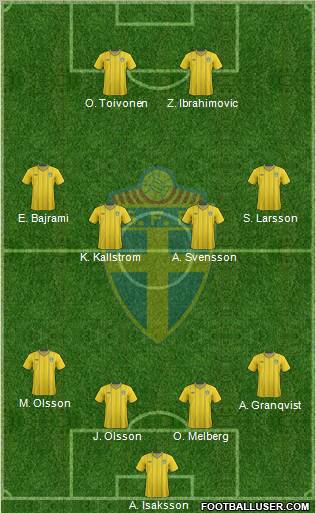 Isaksson · Granqvist · Mellberg · J.Olsson · Lustig · Kallström · Svensson · Elmander · Toivonen · Larsson · Ibrahimovic