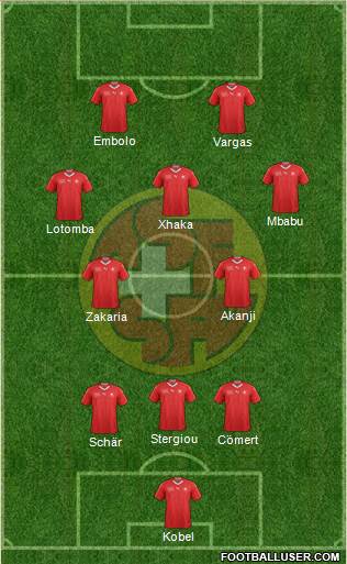 1. BURKI · 3. DJOUROU · 2. HENCHOZ · 4. LICHTSTEINER · 7. CELESTINI · 6. XHAKA · 8. BEHRAMI · 5. VOGEL · 10. EMBOLO · 11. KNUP · 9. DERDIYOK