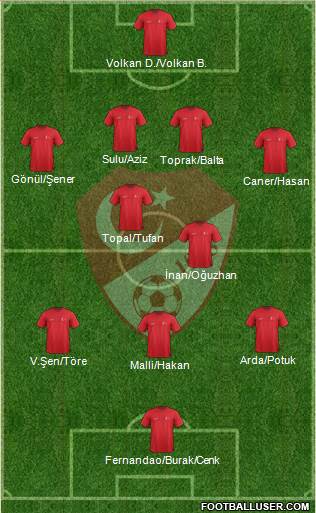 V.Babacan (O.Kivrak) · H.Balta (S.Kaya) · M.Topal (S.Aziz) · C.Erkin (O.Sahan#) · S.Ozbayrakli (G.Gonul) · N.Sahin (V.Sen#) · S.Inan (O.Tufan) · H.Calhanoglu (O.Ozyakup) · G.Tore (C.Tosun) · Arda Turan (Y.Malli) · B.Yilmaz (M.Erdinc)