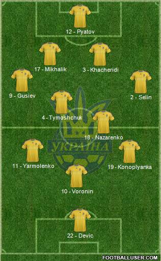 Pyatov · Mykhalik · Khackeridi · Selin · Husiev · Tymoshchuk · Nazarenko · Konoplyanka · Yarmolenko · Voronin · Devic