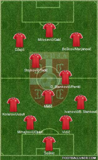21. Matić · 22. Kostić · 23. Petkovic · 19. Galić · 20. D. Stanković · 17. Jugovic · 18. Mitrović · 14. Boškov · 15. Vidić · 16. Pantić · 13. Stojanović · 10. Stojković · 9. Milosević · 12. Pantelić · 11. Mihajlović · 8. Tadić · 5. Djukić · 6. Ivanović · 7. Džajić (c) · 1. Šoškic · 2. Ivković · 3. Kolarov · 4. Vasovic