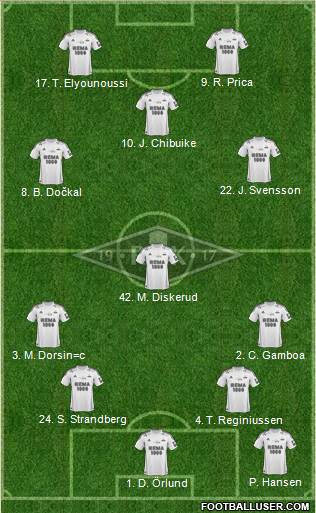 1. D. Örlund · P. Hansen · 4. T. Reginiussen · 24. S. Strandberg · 3. M. Dorsin=c · 2. C. Gamboa · 42. M. Diskerud · 8. B. Dočkal · 22. J. Svensson · 10. J. Chibuike · 17. T. Elyounoussi · 9. R. Prica