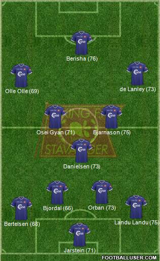 Jarstein (71) · Bertelsen (68) · Landu Landu (75) · Bjordal (66) · Orban (73) · Danielsen (73) · Osei Gyan (71) · Bjarnason (75) · Olle Olle (69) · de Lanley (73) · Berisha (76)