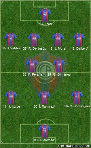13- Jean · 18- B. Valdez · 35- R. De Jesús · 5- J. Morel · 16- Dalbert* · 33- F. Peralta · 28- G. Giménez* · 10- C. Domínguez · 11- J. Iturbe · 30- Í. Ramírez* · 99- A. Alemão*