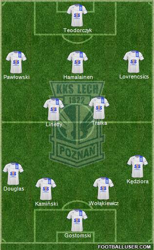 Gostomski · Douglas · Arajuuri · Wołąkiewicz · Możdżeń · Trałka · Linetty · Lovrencsics · Pawłowski · Hamalainen · Teodorczyk