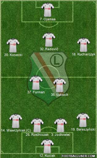 12. Kuciak · 3. Jodłowiec · 25. Rzeźniczak · 14. Wawrzyniak · 28. Broź · 21. Vrdoljak (C) · 37. Furman · 18. Kucharczyk · 7. Ojamaa · 32. Radović · 27. Mikita