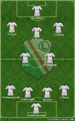 1.Kazimierczak · 6.Milosević · 4.Savić · 3.Król · 14.Wawrzyniak · 5.Gol · 10.Wolski · 37.Furman · 8.Babović · 18.Kucharczyk · 9.Ljuobja