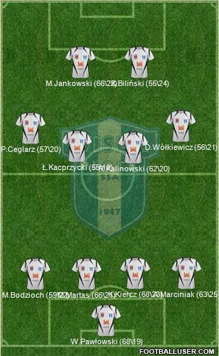 W.Pawłowski (69\20) · M.Martas (67\22) · A.Marciniak (65\25 · M.Bodzioch (59\23) · K.Kiercz (70\24) · P.Ceglarz (58\20) · Jorginho (65\21) · R.Kalinowski (62\21) · M.Makuszewski (63\23) · J.Wójcicki (62\24) · M.Jankowski (67\23)