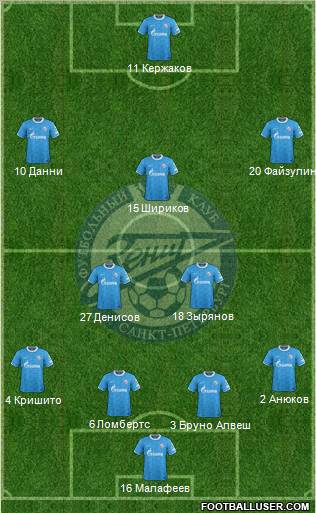 Malafeev · Lombaerts · B. Alves · Anyukov(c) · Criscito · Denisov · Shirokov · Toivonen · Arshavin · Krasic · Kerzhakov