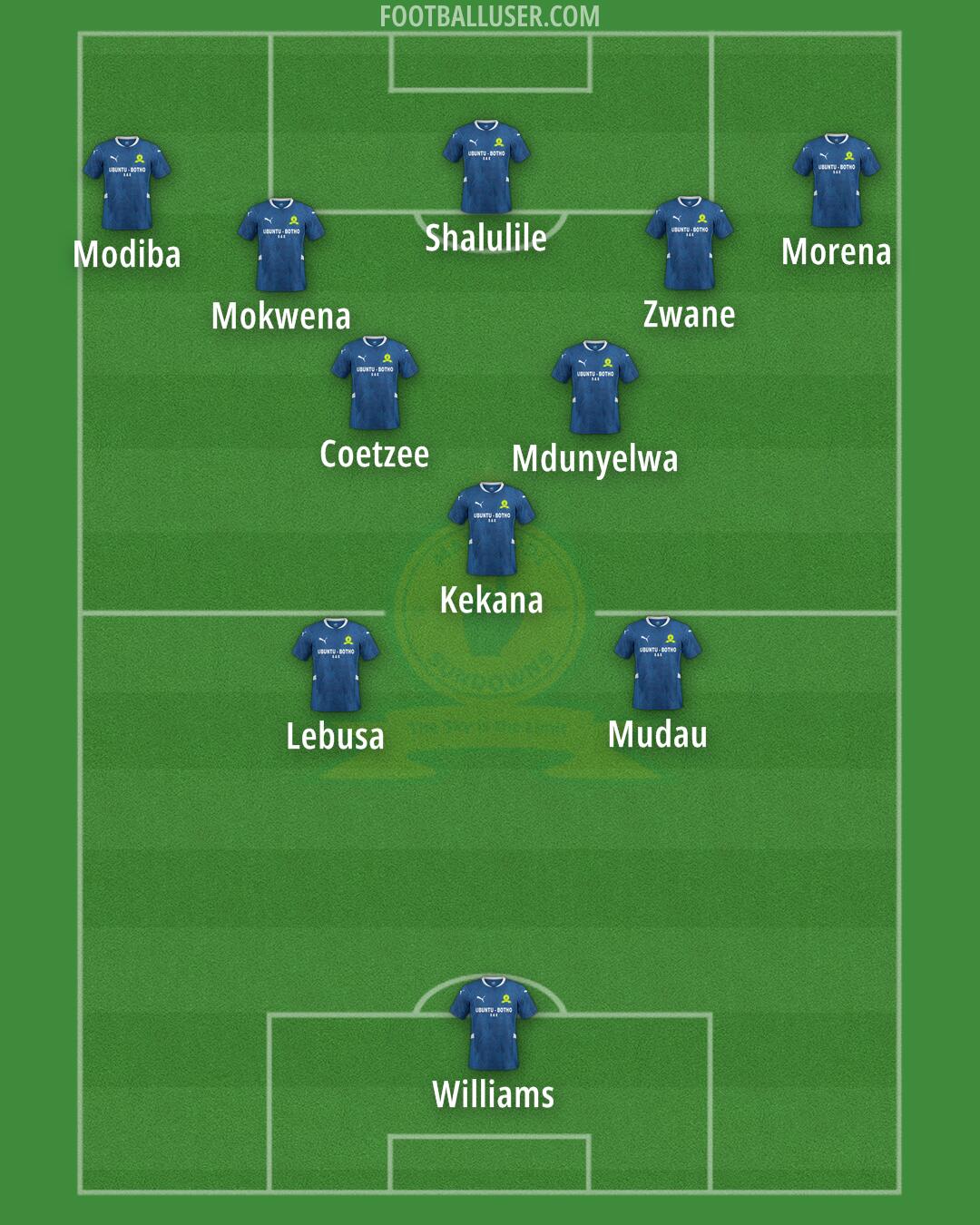 R Williams (30 (GK)) · D Lunga (29 (LB)) · A Cupido (24 (CB)) · G Kekana (20 (CB)) · K Mudau (25 (RB)) · N Santos (10 (AM)) · T Mokoena (4 (DM)) · M Allende (11 (AM)) · P Shalulile (38 (CF)) · I Rayners (13 (CF)) · A Sales (9 (CF))