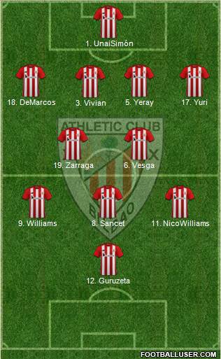 1. UnaiSimón · 18. DeMarcos · 3. Vivian · 15. Lekue · 17. Yuri · 7. Berenguer · 11. NicoW · 21. AHerrera · 6. Vesga · 9. Williams · 10. Muniain