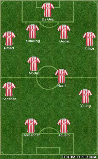Hernandez · Aguero · Young · Sanchez · Nasri · Modric · Filipe · Rafael · Godin · Smalling · De Gea