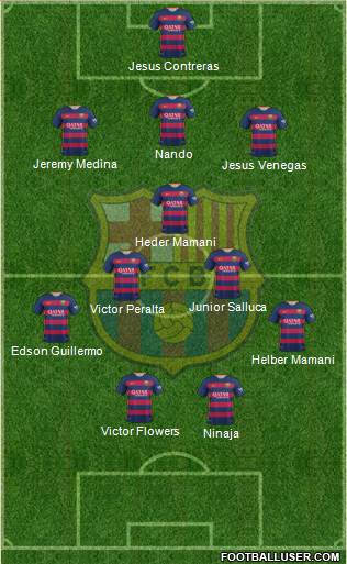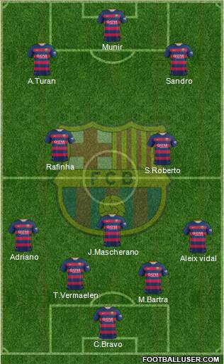 Suárez · Messi · Neymar · Rakitic · Iniesta · Busquets · Dani Alves · Jordi Alba · Piqué · Mascherano · Ter Stegen