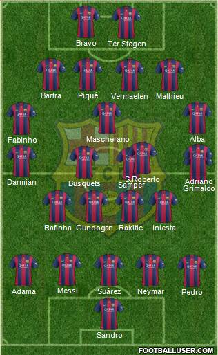Hart · Puyol · Pique · Abidal · Toure · Xavi · Alves · Iniesta · Messi · Henry · Eto