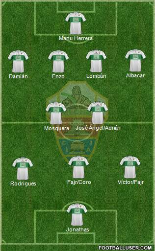 25. Tyton · 4. Lombán · 3. Enzo Roco · 21. Albácar · 2. Damián Suárez · 8. Adrián · 6. Mosquera · 10. Coro · 11. Garry Rodrigues · 17. Víctor · 22. Jonathas
