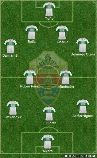1. Manu Herrera · 4. Lombán · 3. Botia · 23. Cisma · 2. Suárez · 6. Rubén Pérez · 17. Javi Márquez · 14. Manu · 15. Carles Gil · 7. Aaron Ñiguez · 11. Coro