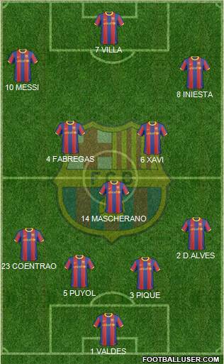 Messi · Pedro · Villa · Xavi · Iniesta · Mascherano · Adriano · Maxwell · Piqué · Abidal · Pinto