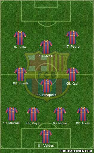 Villa · Pedro · Messi · Iniesta · Xavi · Busquets · Adriano · Abidal · Pique · Puyol (C) · Valdes